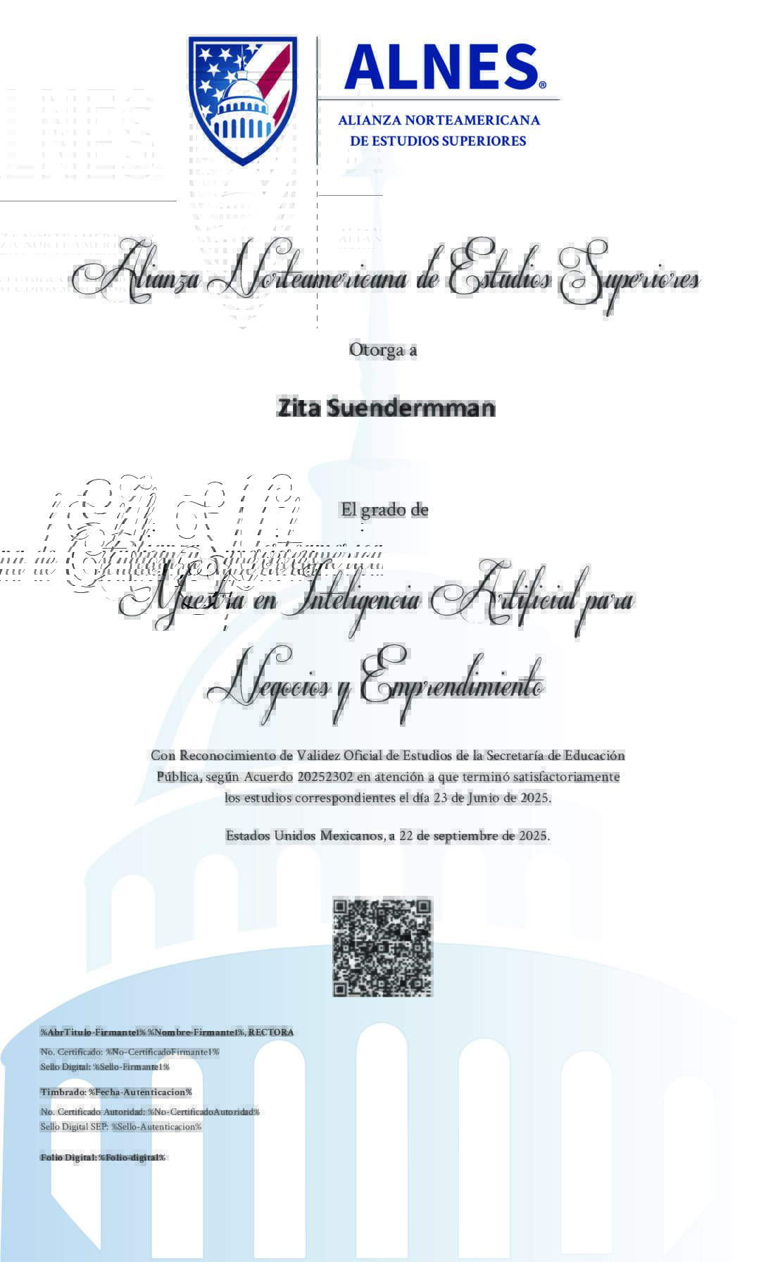 Logra el grado de «Maestría En Inteligencia Artificial para Negocios y Emprendimientos», título con validez internacional, bajo el Reconocimiento de Validez Oficial de Estudios (RVOE) 20252302 emitido por la Secretaría de Educación Pública, Gobierno Federal de los Estados Unidos Mexicanos.