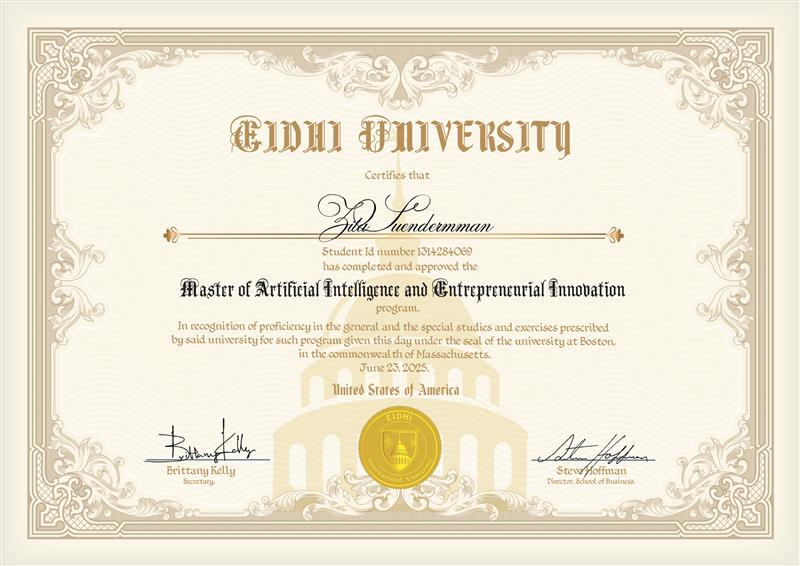 Diploma emitido en USA como «Master of Artificial Intelligence and Entrepreneurial Innovation».